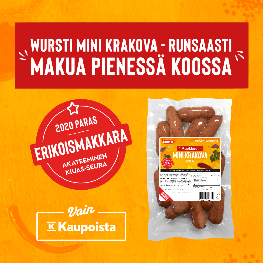 Järvenpääläisen perheyritys Wursti Oy:n Mini Krakova on valittu vuoden 2020 parhaaksi erikoismakkaraksi Akateemisen Kiuas-Seuran (AKS) toimesta, joka vuosittain valitsee Suomen parhaat makkaratuotteet. Wurstin tuotepäällikkö Sallamari Lempinen on ilahtunut voitosta: