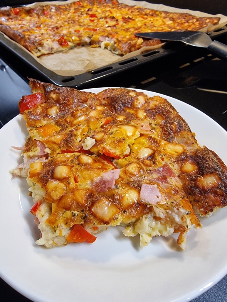 Laita uuni kuumenemaan 225 asteeseen. Sekoita taikinan ainekset keskenään. Anna taikinan tekeytyä sen aikaa, kun valmistelet täytteet. Kuori ja silppua sipuli, kuutioi kinkku, pilko valitsemasi kasvikset. Vuoraa uunipelti leivinpaperilla. Kaada taikina pellille ja lisää täytteet. Viipaloi tomaatit ja ripottele täytteiden päälle. Lisää täytteiden päälle juustoraaste. Lisää lopuksi oregano tai muut mausteet pinnan päälle. Paista uunin keskitasolla n. 35 min. Mikäli pinta uhkaa palaa ennen kuin täyte on kypsä, peitä pinta foliolla. Tarjoile pitsapannari raikkaan salaatin kera.